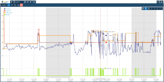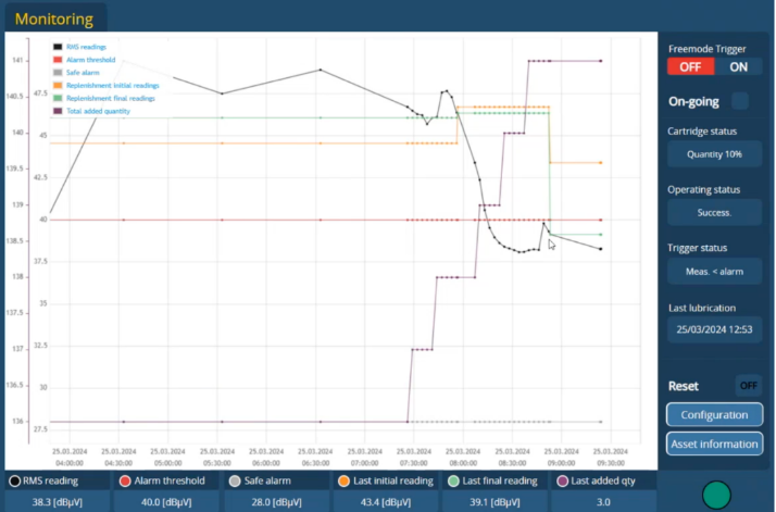 In Figure 2, a 2-week trend of DE of this motor can be observed. Every time it surpasses its designated alarm threshold measured in overall RMS, a greasing event is triggered returning the overall friction to below alarm levels.
